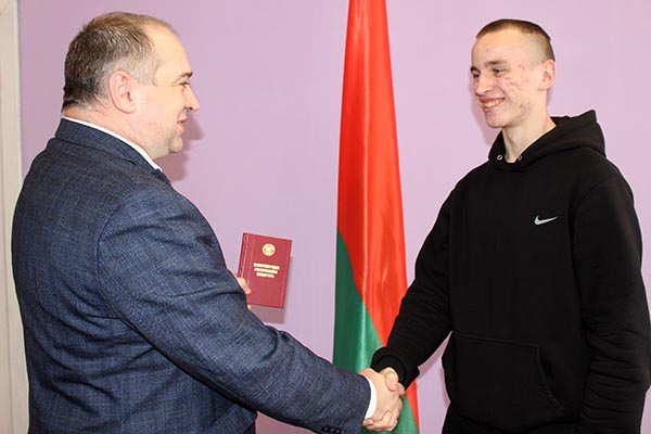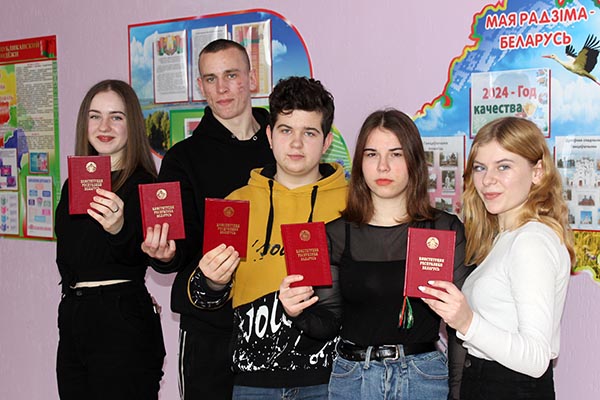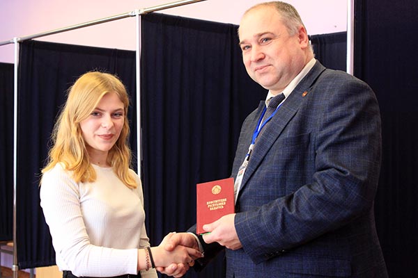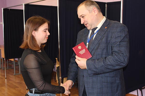 Как только впервые голосующие сделали свой выбор и опустили заполненные бюллетени в урну, их с этим знаменательным событием поздравил председатель избирательной комиссии Александр Трояновский и вручил ребятам подарочные экземпляры Конституции Республики Беларусь.